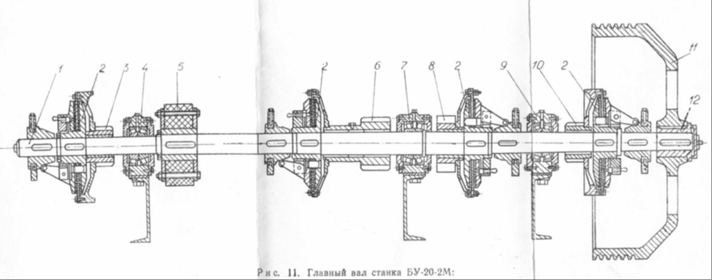 смонтирован на трех опорах; каждая опора состоит из двух конических подшипников, установ ленных внутри сквозных корпусов. Корпуса подшипников зак реплены болтами на раме станка. Передача движения от главного вала к шестерням и включение в работу соответствующего механизма производятся фрикционными муфтами.