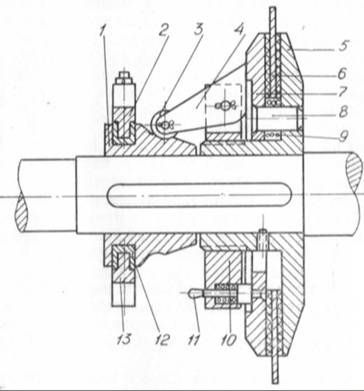 Фрикционная муфта главного станка БУ-20-2М: вала / — бугель; 2 — хомут верх ний; 3 — ролик; 4 — кулачок; 5 - основной диск; б — полукольцо с наклепанным «ферродо» , 7 — прижимной диск; 8 — палец; 9 — пружина; 10 — регулятор; фиксатор; // — 12 — вкладыш; 13 — хомут нижний Все муфты станка однотипны (рис. 12). На главном валу шпонкой закреплен основной диск; на него свободно надет дру гой, прижимной, а между ними расположены два полукольца с наклепанными по обеим сторонам фрикционами (ферродо). Оба диска связаны между собой четырьмя пальцами 1 распираются надетыми на них пружинами, поэтому в свободном состоянии они не соприкасаются с фрикционами и не передают им вращения. С включением муфты диски сжимают полукольца и силой трения приводят их в движение, которое передается шестерням.