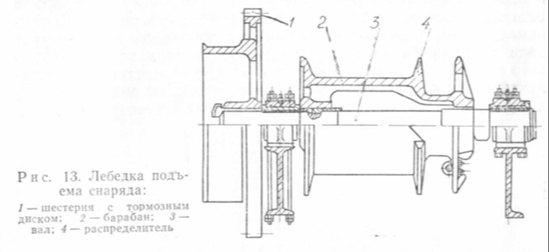 Барабан закреплен на валу, который вращается на двух подшипниках, смонтированных на рамс станка. Подшипники разъемные, с баббитовой заливкой, крепятся на раме болтами; сбоку к ним приварены планки во избежание смещения подшипников при работе. На конце вала закреплена шестерня с тормозным диском, передающая вращение барабану от главного вала. Диск шестерни опоясан ленточным тормозом, который применяется для торможения барабана при спуске снаряда и во время работы ударной балки. При подъеме снаряда барабан следует освободить от тормоза. Канат лебедки прикрепляется к реборде, он должен быть левой свивки для предупреждения отвинчивания бурового инструмента.